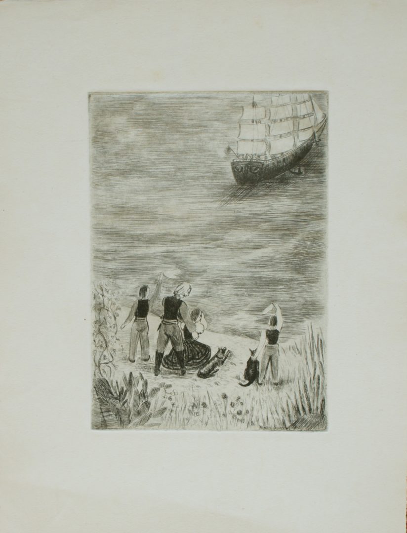 Départ d'un navire Artiste DISERENS Violette Numéro d'inventaire FAA-DV-1795 Titre inconnu Dénomination Départ d'un navire Dimensions sur chassis 25x19 cm Technique / Support Gravure Catégories Scène de genre Signature / Datation "Violette Diserens" bd Remarques - plaque 15.5 x 11 cm - illustration pour le livre ""Robinson suisse" de Jean-David Wyss, édité chez Kaeser Agrandir l'image Découvrez l'artiste DISERENS Violette Lausanne (CH) 2 juin 1888 / 27 avril 1965 Peinture, Gravure Fonds géré par la FAA Consulter sa fiche