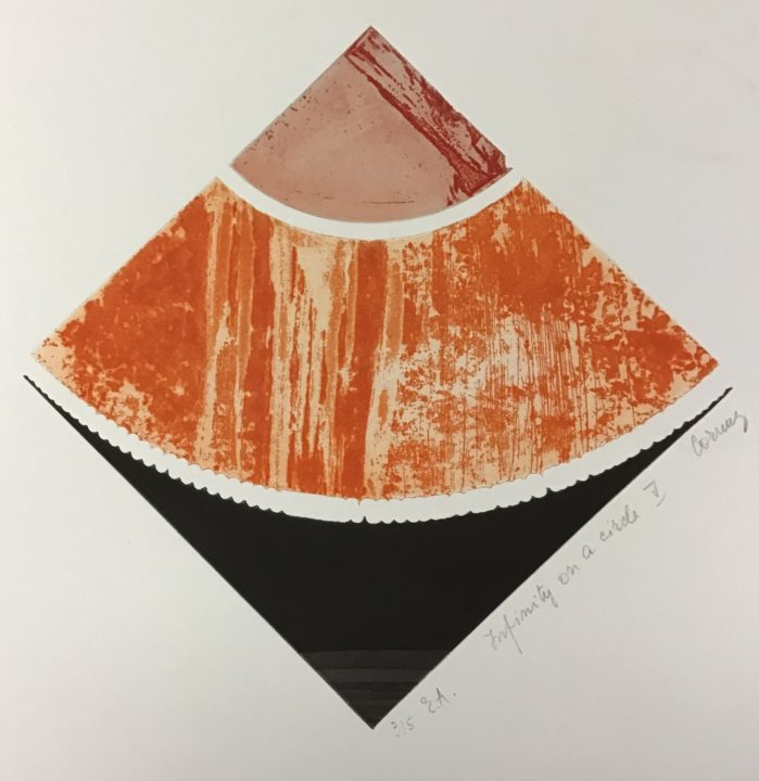 - Cette épreuve et les numéros d’inventaire suivants étaient dans une chemise avec les mentions : « Série Infinity on a circle, 1973, Eau-forte/Aquatinte, Atelier R. Meyer, Pully ».
