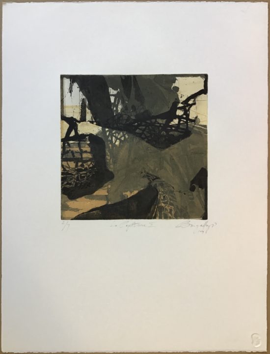 La capture II Artiste BOISGALLAYS Maya Numéro d'inventaire FAA-BM-6131 Titre La capture II Disponibilité Œuvre inaliénable Année 1999 Technique / Support Papier, Eau forte, Aquatinte Catégories Non figuratif Signature / Datation « Boisgallays /1999 » bd Remarques - Une épreuve titrée, signée, datée, et justifiée 2/7 - gaufrage bd Agrandir l'image Découvrez l'artiste BOISGALLAYS Maya Montreux (CH, F) 1949 Peinture, Peinture à l'huile, Xylographie, Lithographie, Gravure, Dessin, Aquarelle Fonds géré par la FAA Consulter sa fiche