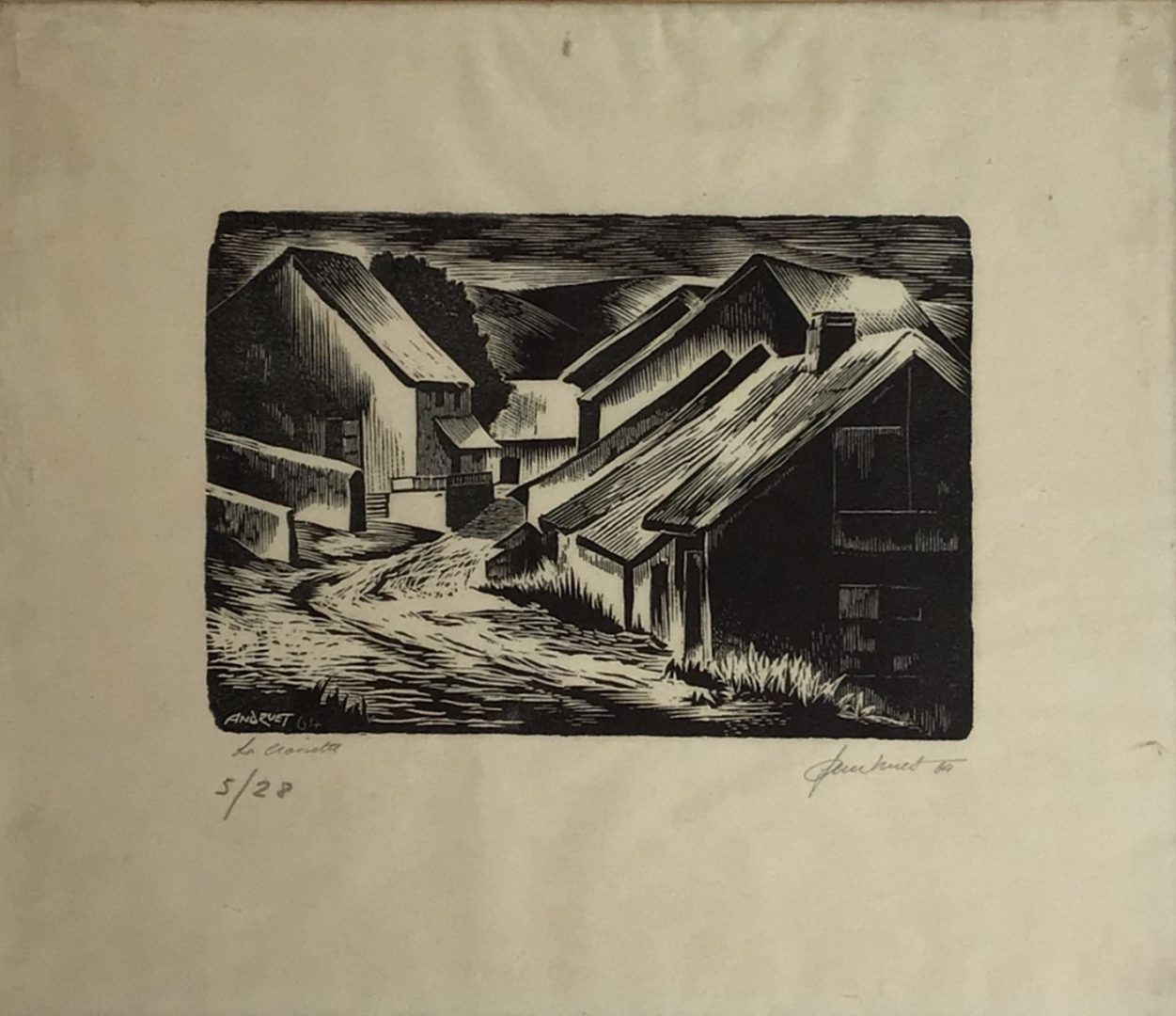 La Croisette Artiste ANDRUET Francis Numéro d'inventaire FAA-AF-5568 Titre La Croisette Année 1964 Technique / Support Papier, Bois, Gravure Catégories Paysage urbain Signature / Datation « Andruet 64 » bg et bd Remarques - Gravure justifilée « 5/28 » et oublement signée. Agrandir l'image Découvrez l'artiste ANDRUET Francis Genève (CH) 28 mai 1923 / 26 décembre 2018 Peinture à l'huile, Aquarelle, Dessin, Xylographie Fonds géré par la FAA Consulter sa fiche