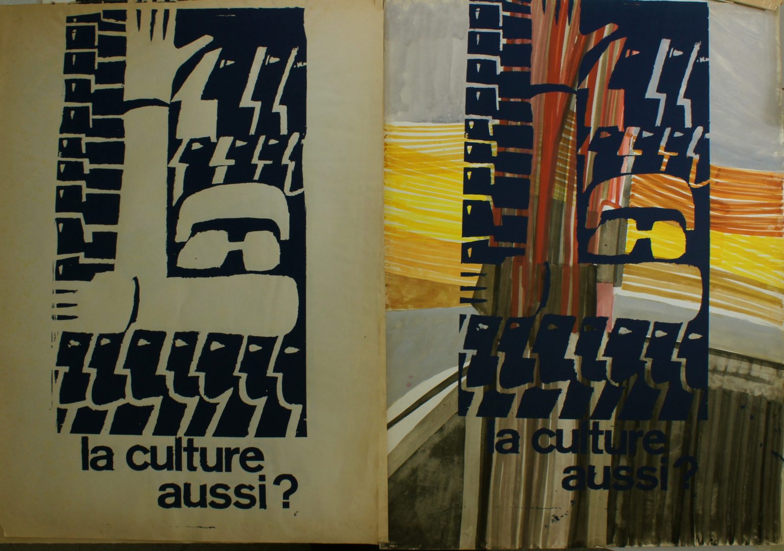 La culture aussi? Artiste MEYSTRE Charles Numéro d'inventaire FAA-MC-2094 Titre La culture aussi? Année 1968 Dimensions sur chassis 75x56 cm Technique / Support Gouache, Pochoir Catégories Scène de genre Remarques - 1 ex gouache de différentes couleurs sur papier Arches - 4 ex monochromes bleus nuits sur papier fin, dont un daté : « Mai 68 » bd et déchiré bg Agrandir l'image Découvrez l'artiste MEYSTRE Charles Thierrens (CH) 1 février 1925 / 18 mars 2013 Fonds géré par la FAA Consulter sa fiche