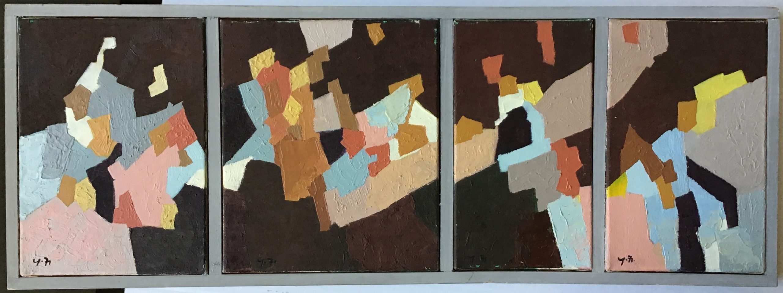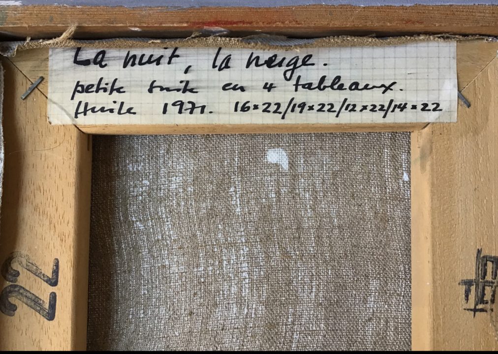 La nuit, la neige, petite suite en 4 tableaux Artiste VOIROL Yves Numéro d'inventaire FAA-VY-5002 Titre La nuit, la neige, petite suite en 4 tableaux Année 1971 Technique / Support Huile, Toile Catégories Non figuratif Signature / Datation « Y. 71 » bg sur chacune des 4 toiles Remarques Le n° d’inventaire renvoie à un travail réalisé par Arnaud Chappuis pour le compte de la famille et de la FAA. Agrandir l'image Découvrez l'artiste VOIROL Yves (CH) 9 octobre 1931 / 5 novembre 2015 Fonds géré par la FAA Consulter sa fiche Images complémentaires VOIROL Yves – La nuit, la neige, petite suite en 4 tableaux 1971 – Huile, Toile – Non figuratif