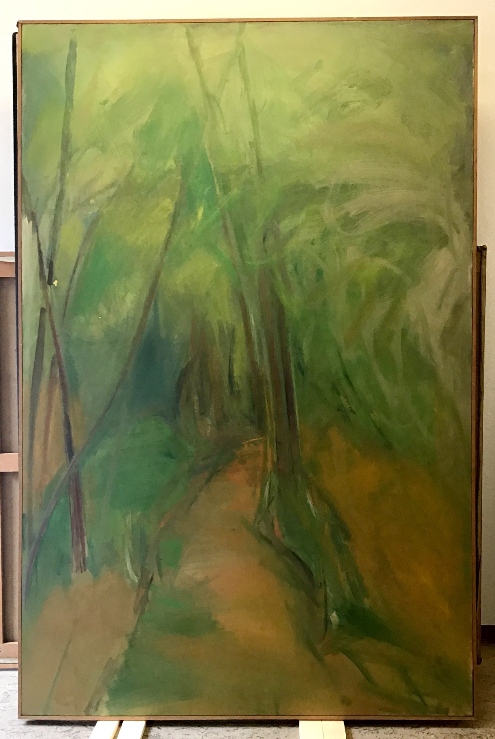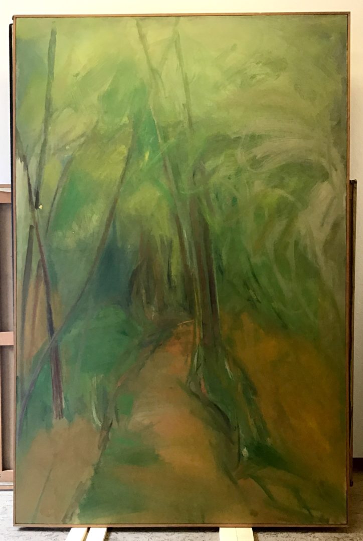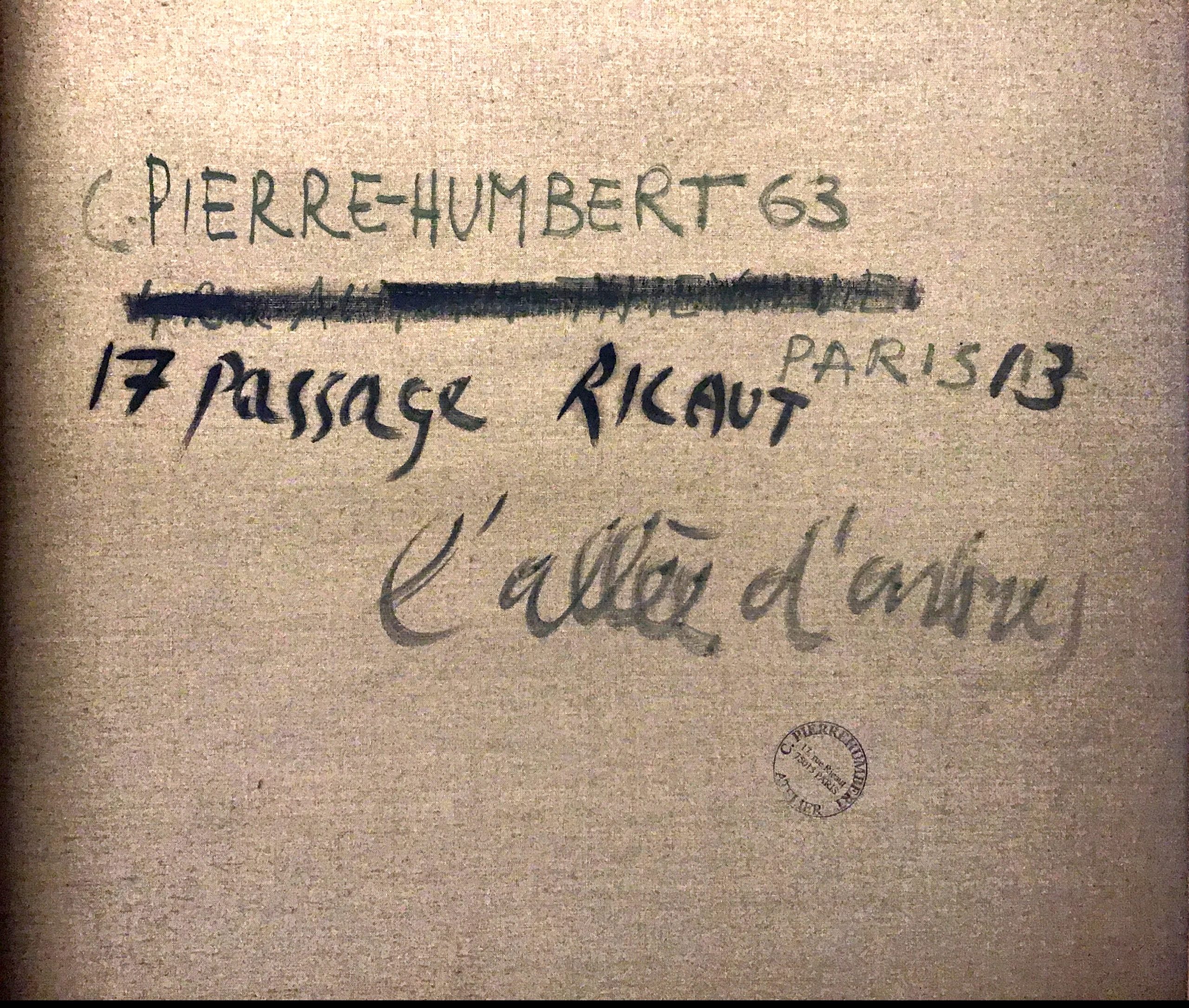 - première signature avec la date 1963 et une adresse biffée correspondant sans doute à un premier tableau, puis l’adresse « 17 Passage Ricau, Paris 13 » avec le titre correspondant sur-peint