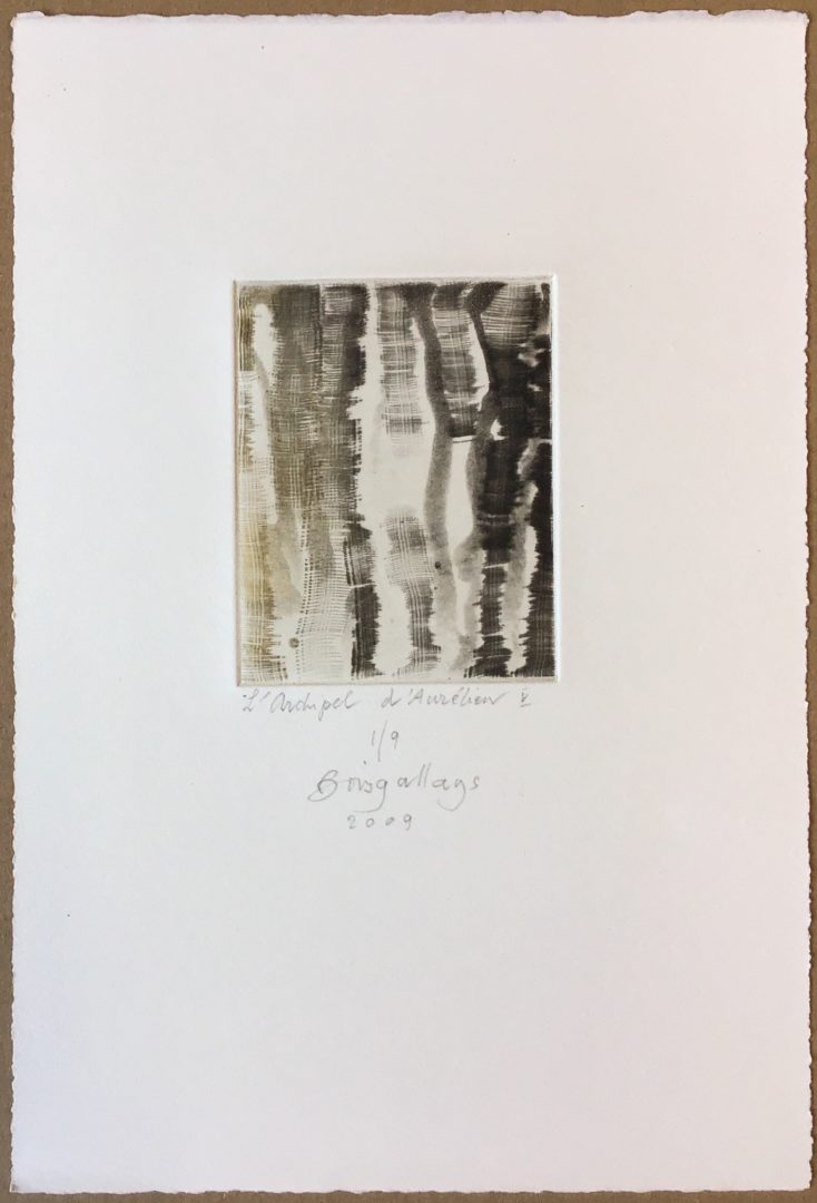 L’Archipel d’Aurélien V Artiste BOISGALLAYS Maya Numéro d'inventaire FAA-BM-6157 Titre L’Archipel d’Aurélien V Disponibilité Œuvre inaliénable Année 2009 Technique / Support Aquatinte, Eau forte, Papier Catégories Paysage Signature / Datation « Boisgallays /2009 » bm Remarques - Épreuve signée, datée, titrée et justifiée 1/9 - Au verso le prix: « 80.— « - 2ème épreuve version BN « Bibliothèque nationale [de France?] » Agrandir l'image Découvrez l'artiste BOISGALLAYS Maya Montreux (CH, F) 1949 Peinture, Peinture à l'huile, Xylographie, Lithographie, Gravure, Dessin, Aquarelle Fonds géré par la FAA Consulter sa fiche
