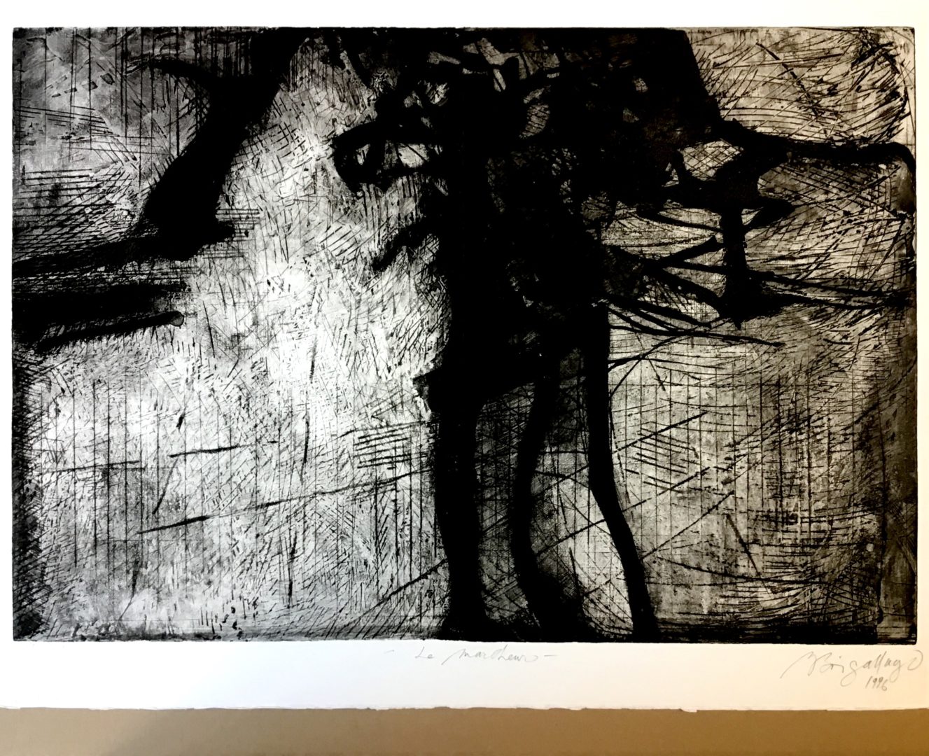 Le Marcheur Artiste BOISGALLAYS Maya Numéro d'inventaire FAA-BM-6144 Titre Le Marcheur Disponibilité Œuvre inaliénable Année 1996 Technique / Support Eau forte, Papier, Aquatinte Catégories Figure Signature / Datation « M. Boisgallays /1996 » bd Remarques - Épreuve signée, datée, titrée et justifiée « BN à Bern » - note en bas à gauche « Pour BN CH » Agrandir l'image Découvrez l'artiste BOISGALLAYS Maya Montreux (CH, F) 1949 Peinture, Peinture à l'huile, Xylographie, Lithographie, Gravure, Dessin, Aquarelle Fonds géré par la FAA Consulter sa fiche