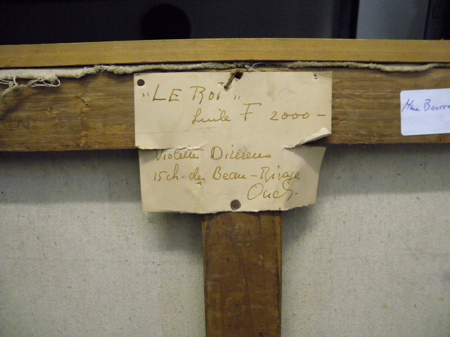 Le Roi Artiste DISERENS Violette Numéro d'inventaire FAA-DV-1529 Titre Le Roi Année 1953 Dimensions sur chassis 100x73 cm Technique / Support Huile, Toile Catégories Portrait Signature / Datation "Violette Diserens /1953 » bd Expositions Galerie Zak, Paris Remarques - manquement pictural md - prix historique au dos F. 2000.--- Agrandir l'image Découvrez l'artiste DISERENS Violette Lausanne (CH) 2 juin 1888 / 27 avril 1965 Peinture, Gravure Fonds géré par la FAA Consulter sa fiche Images complémentaires DISERENS Violette – Le Roi 1953 – Huile, Toile, 100x73 cm – Portrait