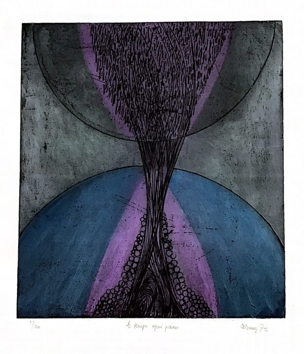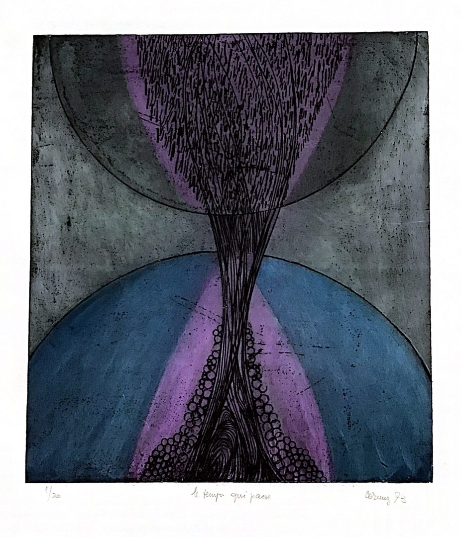 Le temps qui passe Artiste CORNUZ-MOLLES Christiane Numéro d'inventaire FAA-CC-3713 Titre Le temps qui passe Année 1973 Technique / Support Aquatinte, Papier Catégories Non figuratif Signature / Datation « Cornuz 73 » bd Remarques - 2 épreuves justifiées 8/20 et 9/20, titrées, signées et datées Agrandir l'image Découvrez l'artiste CORNUZ-MOLLES Christiane (CH) 19 janvier 1939 / 11 juillet 2005 Fonds géré par la FAA Consulter sa fiche