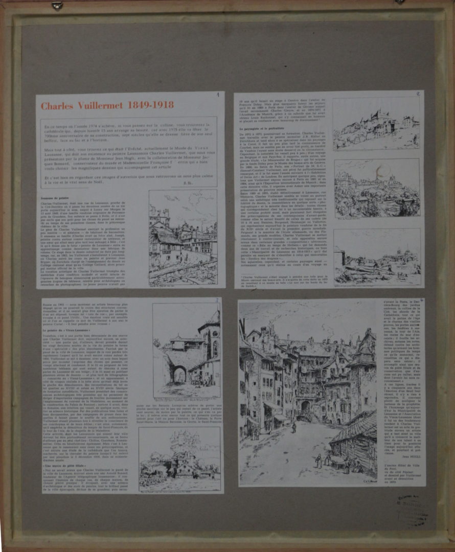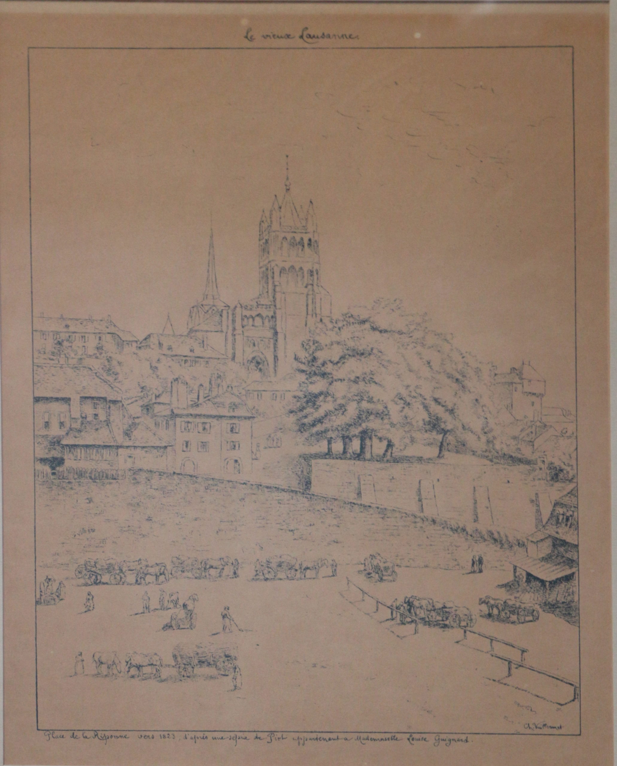 Le Vieux Lausanne – Place de la Riponne Artiste VUILLERMET Charles (François) Numéro d'inventaire FAA-VC-3063 Titre Le Vieux Lausanne – Place de la Riponne Année 1823 Dimensions sur chassis 41x30.5 cm Technique / Support Lithographie Catégories Paysage urbain Signature / Datation "CH. Vuillermet" bd dans la plaque Agrandir l'image Découvrez l'artiste VUILLERMET Charles (François) (CH) 13 août 1849 / 5 décembre 1918 Fonds géré par la FAA Consulter sa fiche Images complémentaires VUILLERMET Charles (François) – Le Vieux Lausanne – Place de la Riponne 1823 – Lithographie, 41x30.5 cm – Paysage urbain