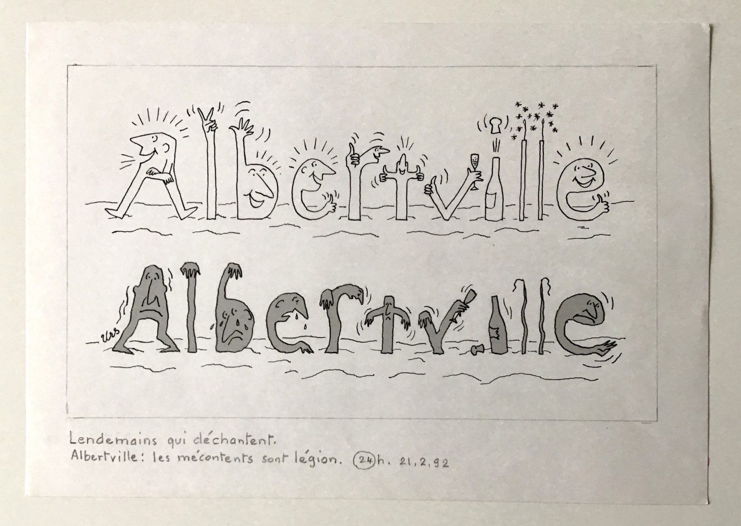 Lendemains qui déchantent Artiste URS (Frédéric Studer) Numéro d'inventaire FAA-URS-4389 Titre Lendemains qui déchantent Année 1992 Technique / Support Encre, Trame, Papier Catégories Scène de genre Remarques - titre complet « Lendemains qui édchantent. Albertville : les mécontents sont légion - « 24h. 21.2.92 Agrandir l'image Découvrez l'artiste URS (Frédéric Studer) (CH) 26 mai 1926 / 22 octobre 2005 Fonds géré par la FAA Consulter sa fiche