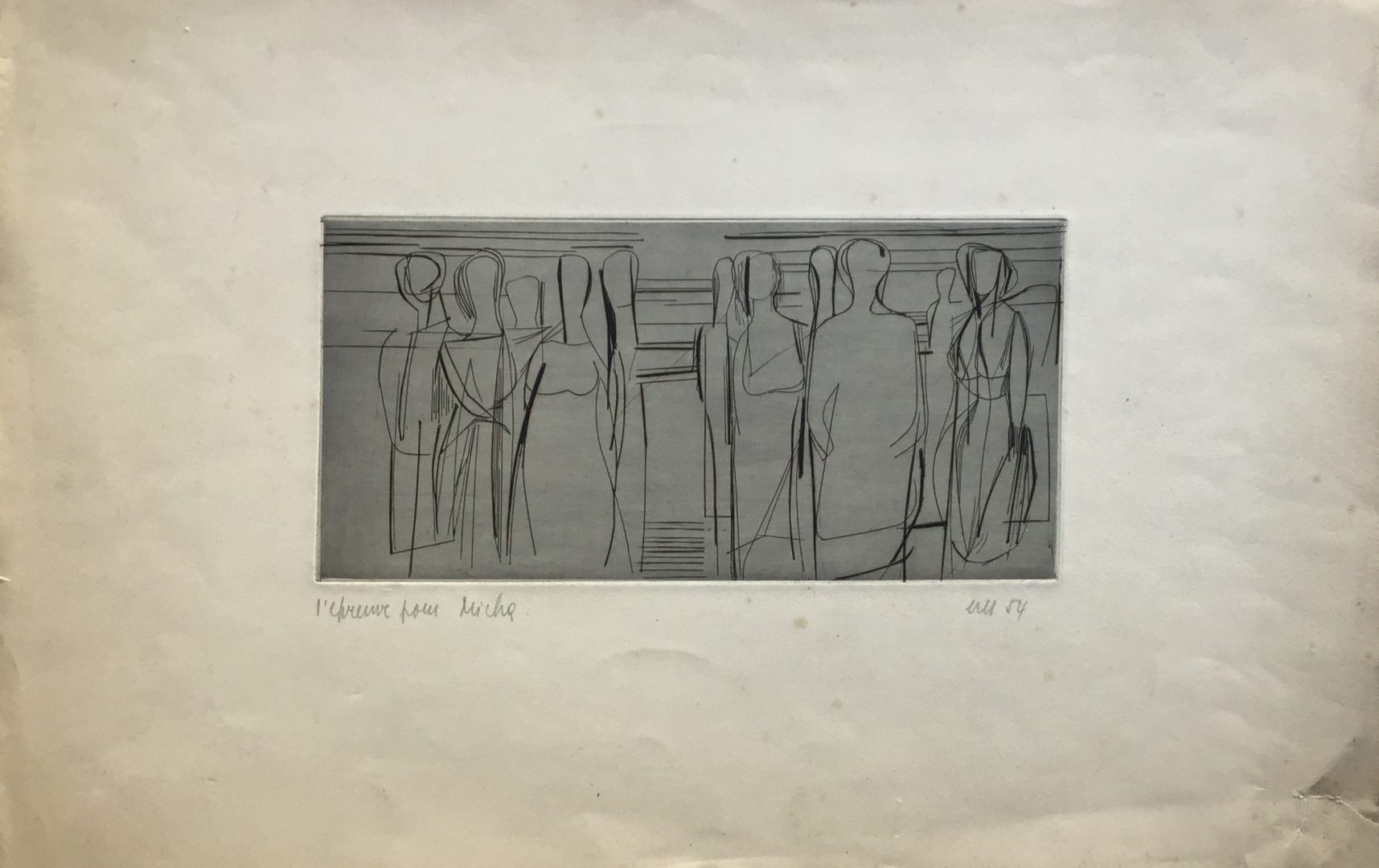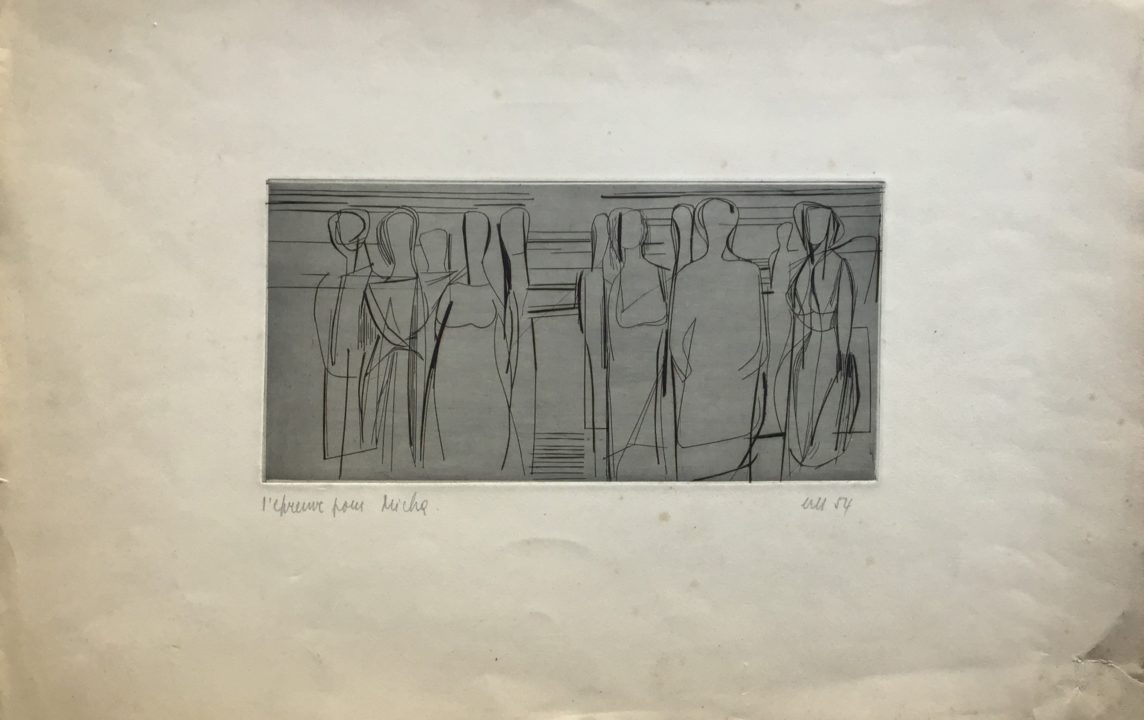 Les personnages Artiste MEYSTRE Charles Numéro d'inventaire FAA-MC-5738 Titre Les personnages Année 1954 Technique / Support Papier, Burin Catégories Scène de genre Signature / Datation « M 54 » bd Remarques - avec mention : « épreuve pour Micha » bg - titre issu du Petit classeur noir (p. 3, section 5/orange) - papier piqué par l’humidité et déchiré bd Agrandir l'image Découvrez l'artiste MEYSTRE Charles Thierrens (CH) 1 février 1925 / 18 mars 2013 Fonds géré par la FAA Consulter sa fiche