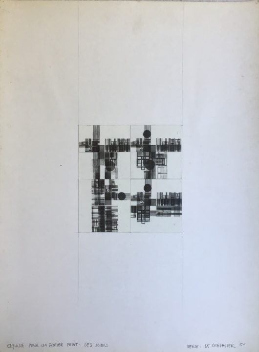- 1 projet (65x50cm) avec inscription en bas : « ESQUISSE POUR UN PAPIER PEINT : LES SOLEILS ; DEVISE : LE CHEVALIER ». Photographies des gravures qui suivent.