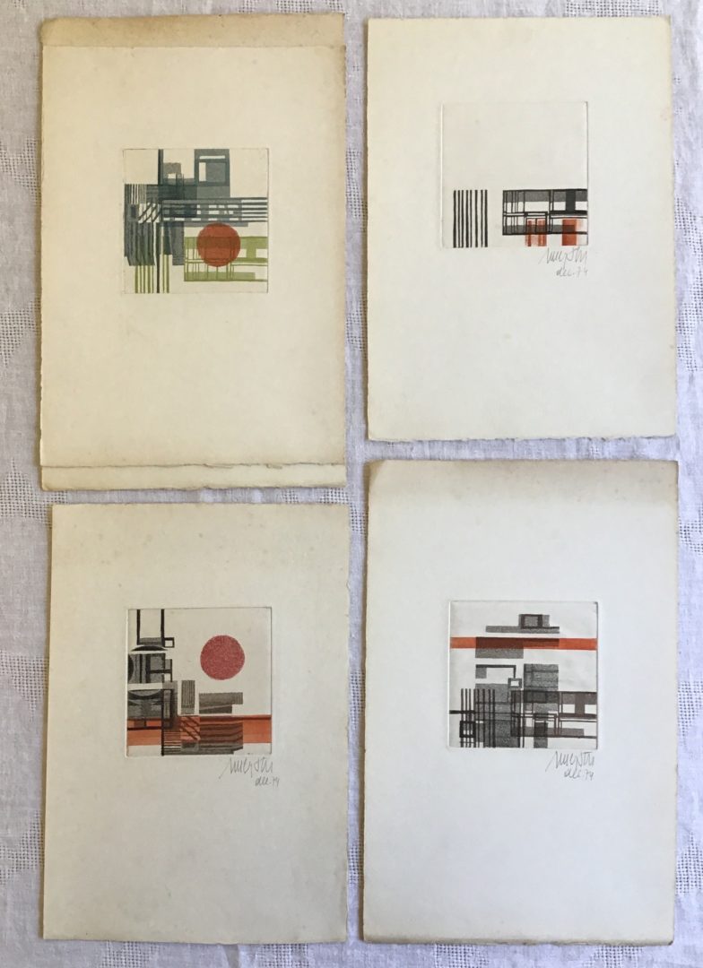 - 3 épreuves aquatintes (29x20,5cm) combinant différentes plaques ; signées et datées « Meystre / déc. 74 » bd