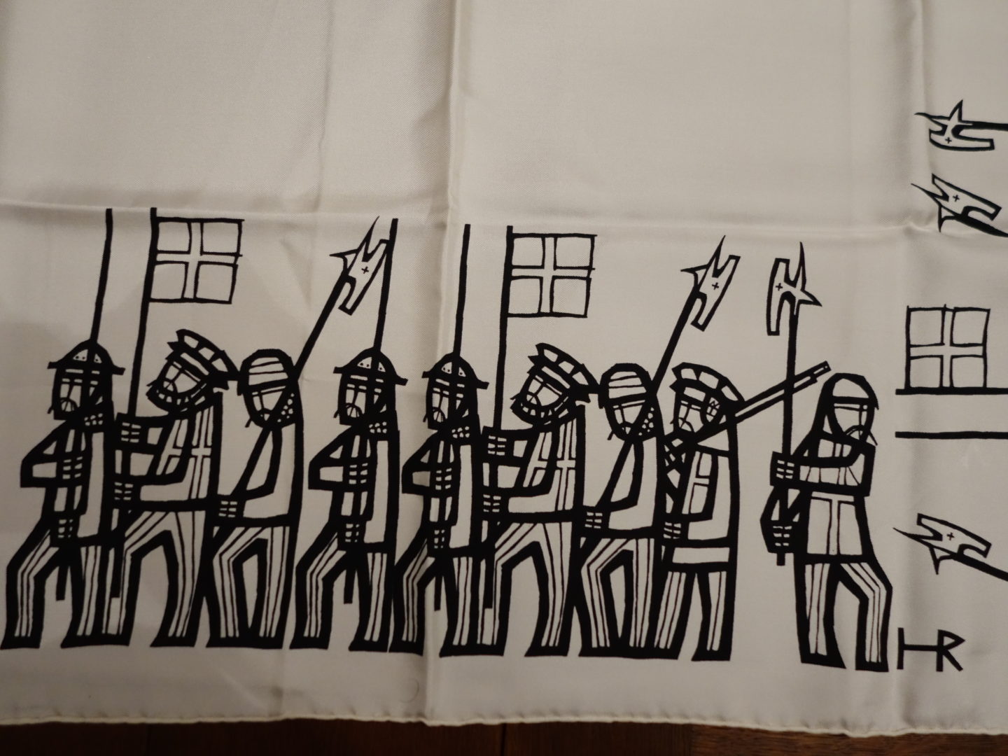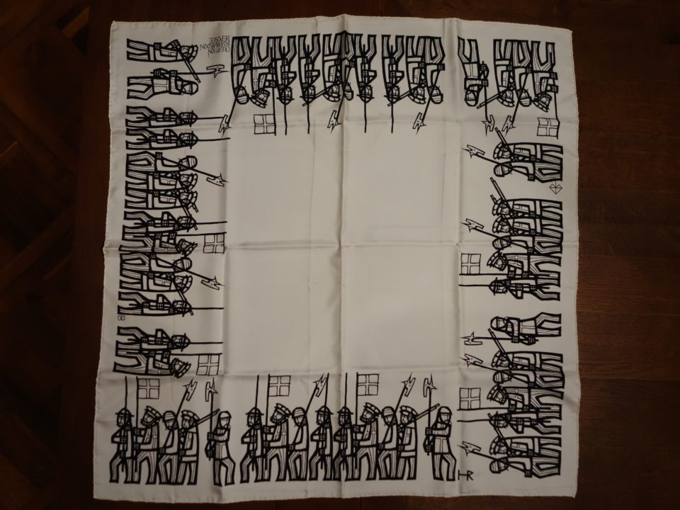 Marignan Artiste HERITIER Robert Numéro d'inventaire FAA-HER-2821 Titre Marignan Dénomination Foulard Année 1965 Dimensions sur chassis 80x80 cm Technique / Support Impression, Couleur, Soie Catégories Scène de genre Signature / Datation "HR" bd Remarques - 2 exemplaires - "Création Bombardon déposée" hg: édition de Max Roth dont le nom de Bombardon est l'alias. - D'après www.abebooksfr, il s'agit d'une édition du Dolder Grand Hôtel de 1965. Agrandir l'image Découvrez l'artiste HERITIER Robert 2 août 1926 / 8 juin 1971 Peinture, Gravure, Mosaïque, Céramique, Graphisme Fonds géré par la FAA Consulter sa fiche Images complémentaires HERITIER Robert – Marignan 1965 – Impression, Couleur, Soie, 80x80 cm – Scène de genre