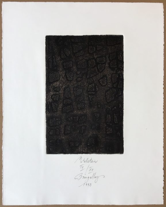 Metallstein Artiste BOISGALLAYS Maya Numéro d'inventaire FAA-BM-6205 Titre Metallstein Disponibilité Œuvre inaliénable Année 1993 Technique / Support Aquatinte, Eau forte, Papier Catégories Non figuratif Signature / Datation « Boisgallays /1993 » bm Remarques - une épreuve titrée, signée, datée et justifiée IX/XII - au verso: « 900.—« Agrandir l'image Découvrez l'artiste BOISGALLAYS Maya Montreux (CH, F) 1949 Peinture, Peinture à l'huile, Xylographie, Lithographie, Gravure, Dessin, Aquarelle Fonds géré par la FAA Consulter sa fiche