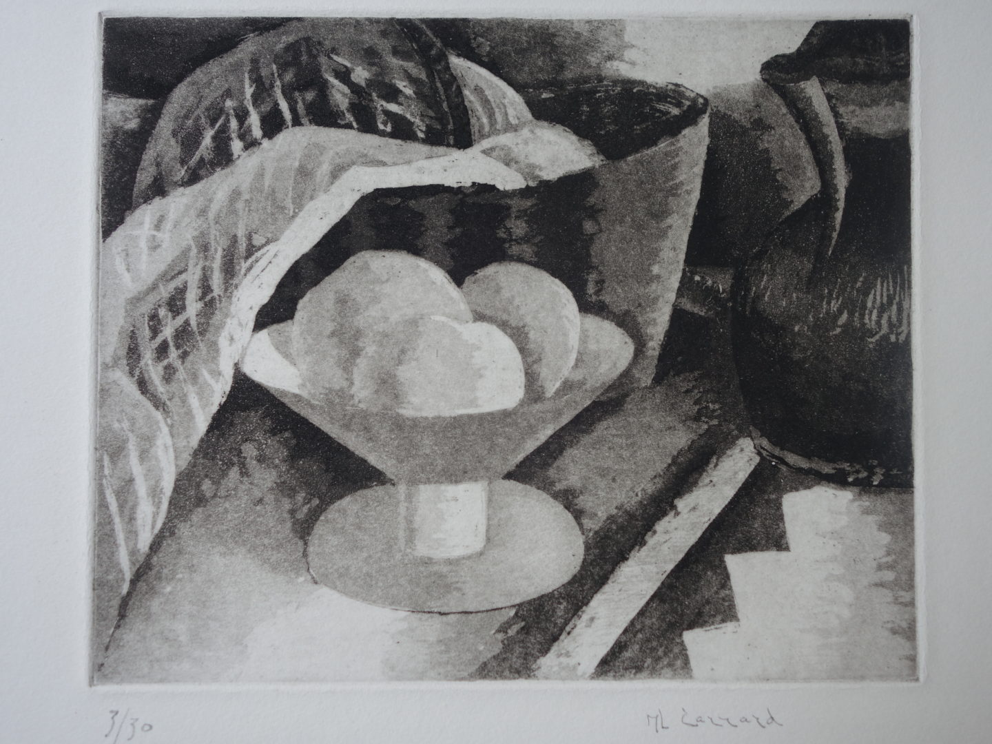 Nature morte – Coupe de fruits Artiste CARRARD-KOHLER Marie-Louise Numéro d'inventaire FAA-CML-3387 Titre Nature morte – Coupe de fruits Année 1967 Dimensions sur chassis 34x43.5 cm Technique / Support Aquatinte Catégories Nature morte Signature / Datation "ML Carrard" bd Remarques - 4 épreuves justifiées 3/30 à 6/30 - Titre manuscrit sur le journal d'emballage de la plaque, daté 1967 Agrandir l'image Découvrez l'artiste CARRARD-KOHLER Marie-Louise Châtelard Orbe (CH) 5 septembre 1901 / 1 décembre 1981 Fonds géré par la FAA Consulter sa fiche