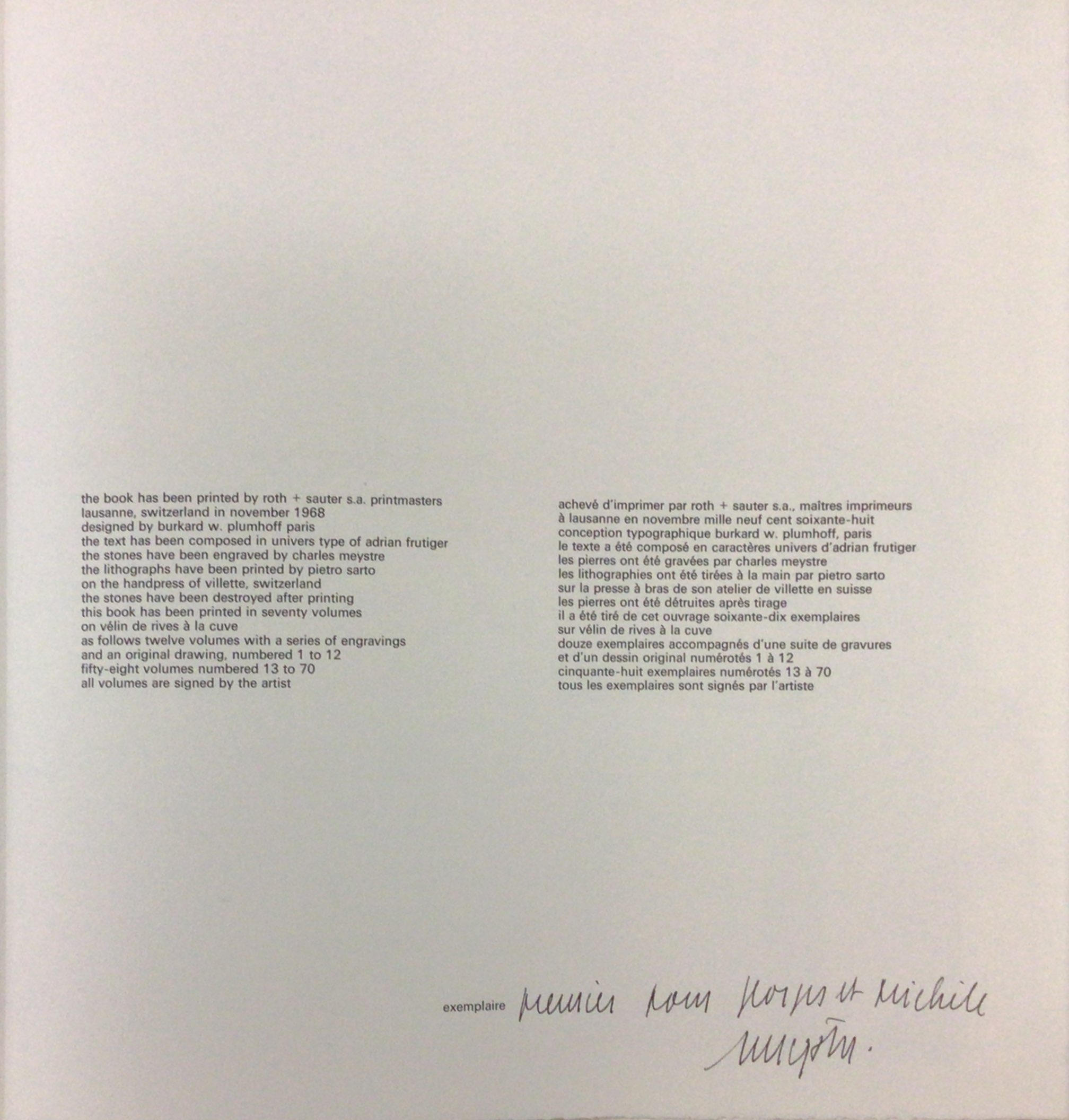 - 1 « exemplaire premier » signé et dédicacé « pour Georges et Michèle / Meystre » dans un support en bois et plexiglas ; avec 12 lithographies originale à la fin