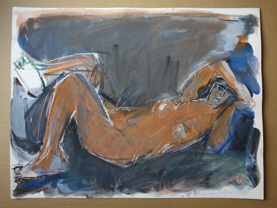 Etiquette collée au dos comportant titre, technique, dimensions et code barre. La technique est indiquée: "Pastel", mais c'est bien une gouache aux traits de craie grasse