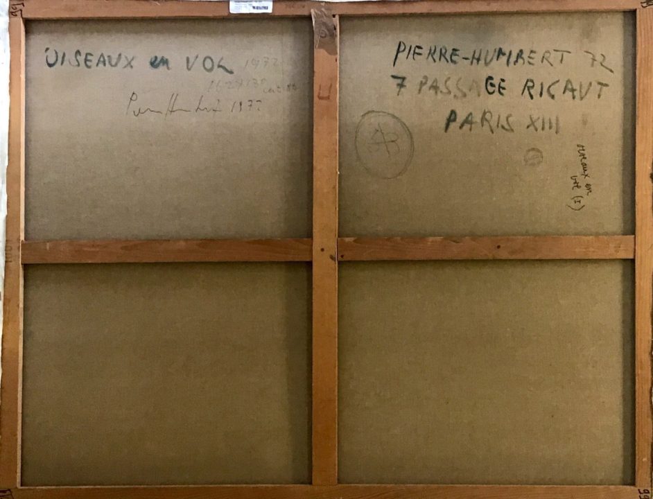 Oiseaux en vol Artiste PIERRE-HUMBERT Charles Numéro d'inventaire FAA-PHC-3831 Titre Oiseaux en vol Disponibilité Œuvre inaliénable Année 1972 Technique / Support Huile, Toile Catégories Animaux Signature / Datation « PierreHumbert 72 » bd Remarques - titre au dos - indication au dos « Cat. 86 » - étiquette collée au dos avec No S012847 (voir la photo du dos ; l’étiquette est tombée) Agrandir l'image Découvrez l'artiste PIERRE-HUMBERT Charles Thielle (NE) (CH) 10 septembre 1920 / 20 octobre 1992 Peinture, Lithographie, Mosaïque, Vitrail Fonds géré par la FAA Consulter sa fiche Images complémentaires PIERRE-HUMBERT Charles – Oiseaux en vol 1972 – Huile, Toile – Animaux