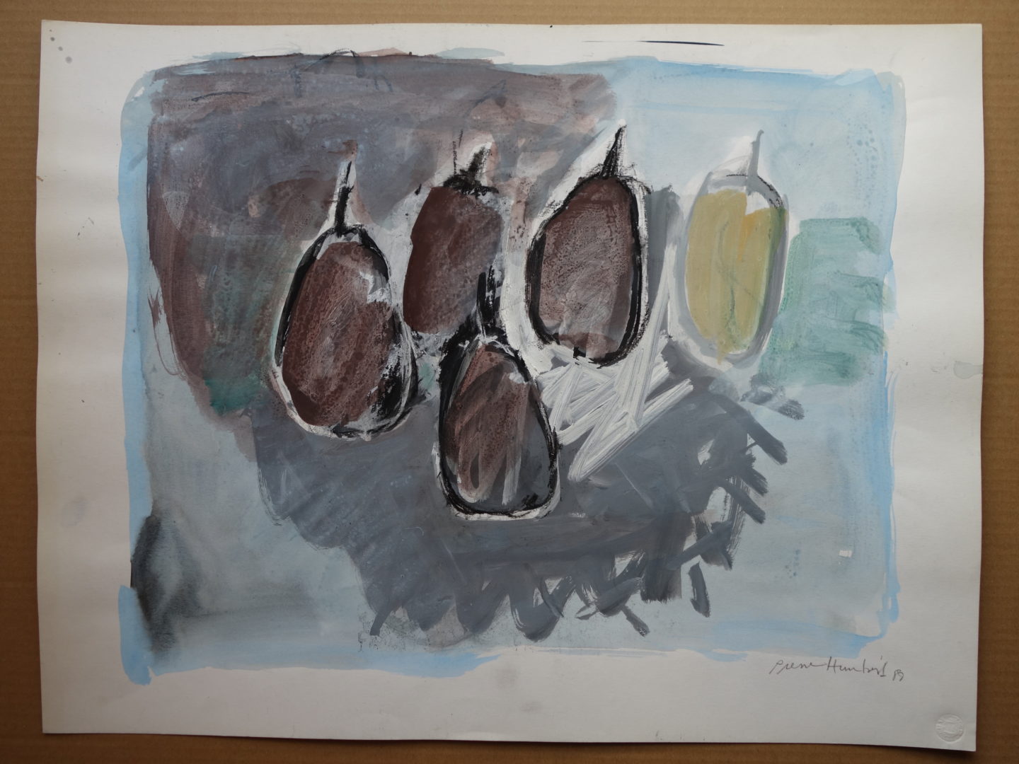 Poires sur fond gris Artiste PIERRE-HUMBERT Charles Numéro d'inventaire FAA-PHC-2942 Titre Poires sur fond gris Année 1987 Dimensions sur chassis 50x65 cm Technique / Support Gouache, Craie grasse Catégories Nature morte Signature / Datation "PierreHumbert 87" bd Remarques Titre au dos Etiquette collée au dos, comportant titre, technique, dimensions et code barres Agrandir l'image Découvrez l'artiste PIERRE-HUMBERT Charles Thielle (NE) (CH) 10 septembre 1920 / 20 octobre 1992 Peinture, Lithographie, Mosaïque, Vitrail Fonds géré par la FAA Consulter sa fiche