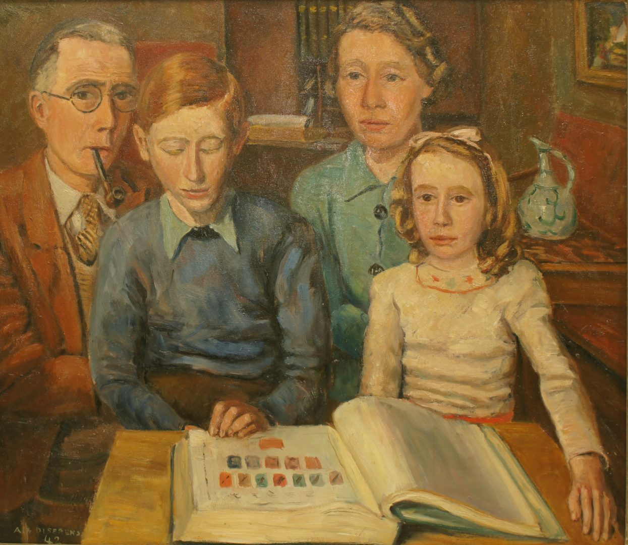 Portrait de famille Artiste DISERENS Albert Numéro d'inventaire FAA-DA-1630 Titre Portrait de famille Année 1942 Dimensions sur chassis 65x75 cm Technique / Support Huile, Ardoise Catégories Portrait Signature / Datation Alb. Diserens/42 (BG) Remarques - voir études AA-DA1949 Agrandir l'image Découvrez l'artiste DISERENS Albert Lausanne (CH) 24 décembre 1891 / 9 mars 1967 Fonds géré par la FAA Consulter sa fiche