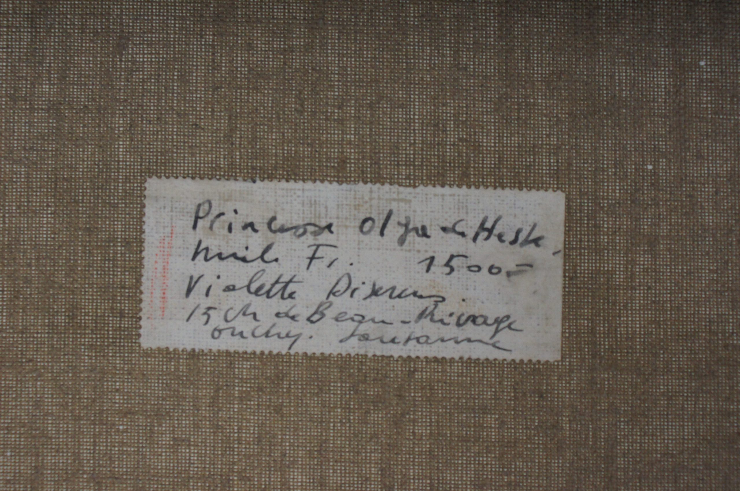 Princesse Olga de Heste? Artiste DISERENS Violette Numéro d'inventaire FAA-DV-1515 Titre Princesse Olga de Heste? Dimensions sur chassis 82x61 cm Technique / Support Huile, Toile Catégories Portrait Signature / Datation "Violette Diserens" bd Remarques - prix historique Fr. 1'500.- Agrandir l'image Découvrez l'artiste DISERENS Violette Lausanne (CH) 2 juin 1888 / 27 avril 1965 Peinture, Gravure Fonds géré par la FAA Consulter sa fiche Images complémentaires DISERENS Violette – Princesse Olga de Heste? – Huile, Toile, 82x61 cm – Portrait
