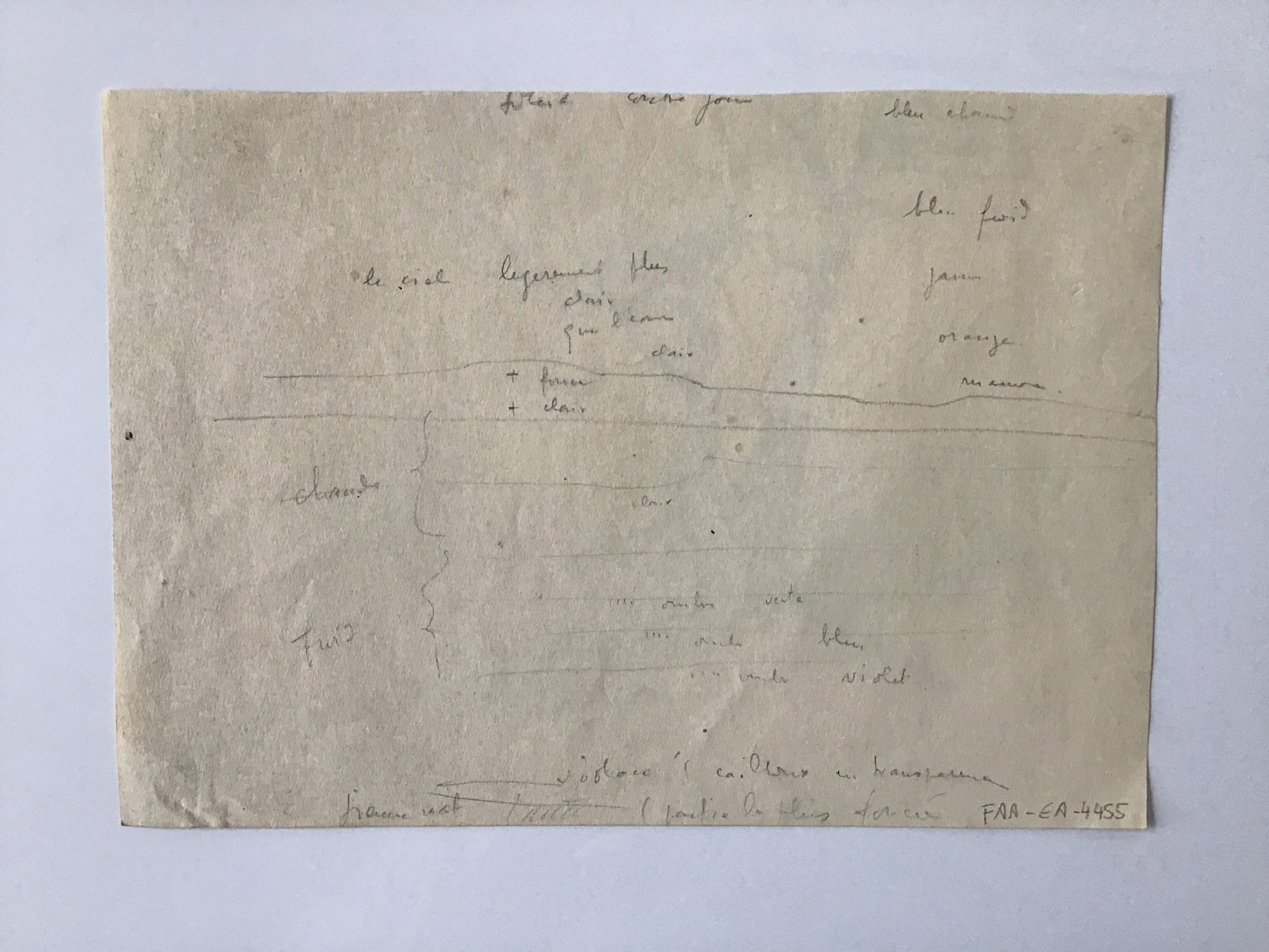 Saule au bord du lac de Neuchâtel Artiste ENZ Albert Numéro d'inventaire FAA-EA-4433 Titre Saule au bord du lac de Neuchâtel Technique / Support Crayon, Papier Catégories Paysage lacustre Remarques - croquis de paysage lacustre très sommaire au dos, avec indications de couleurs (voir 2e photo) Agrandir l'image Découvrez l'artiste ENZ Albert Winterthur (CH, F) 25 septembre 1909 / 11 mai 1982 Fonds géré par la FAA Consulter sa fiche Images complémentaires ENZ Albert – Saule au bord du lac de Neuchâtel – Crayon, Papier – Paysage lacustre