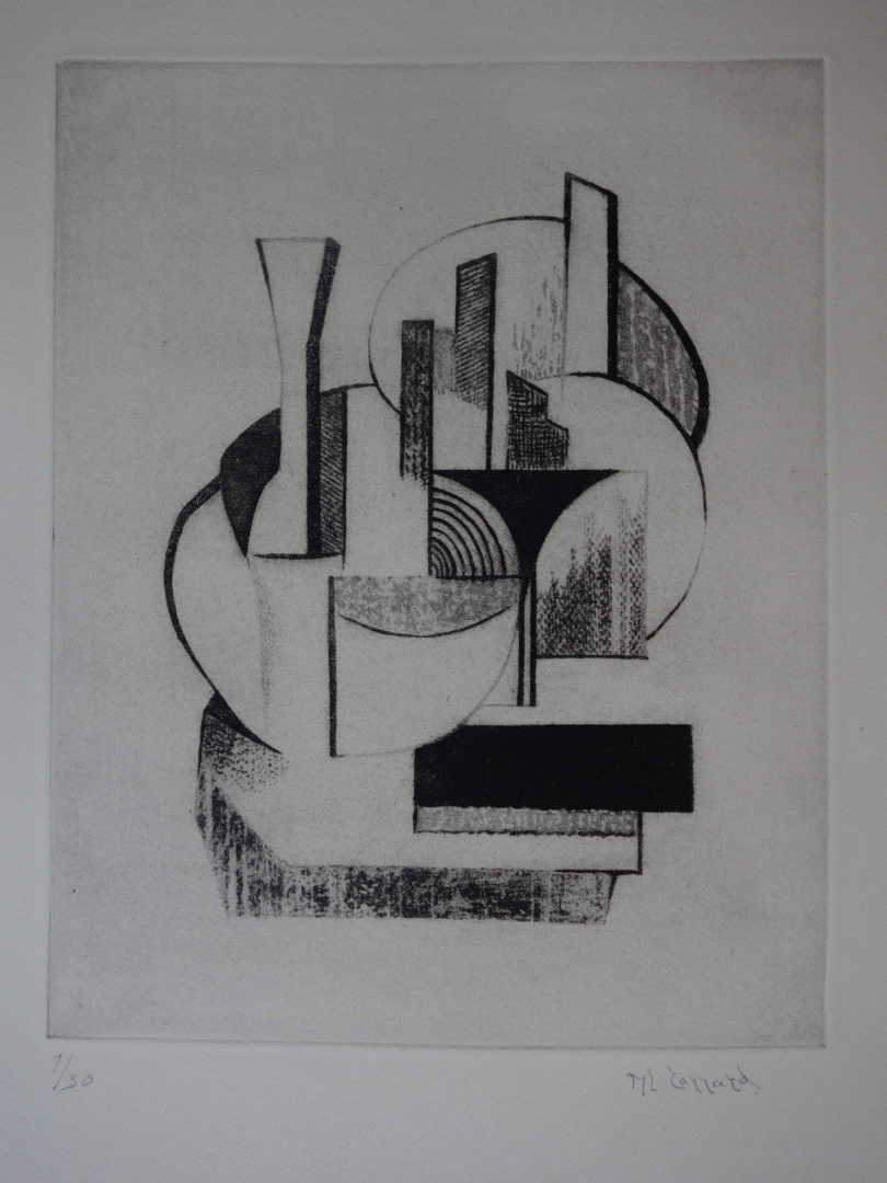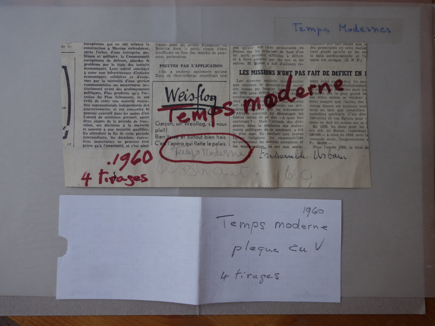 - Titre et date figurant sur un feuillet joint, une feuille intercalaire, avec la variante "Temps modernes" et sur le journal d'emballage de la plaque, avec les indications: "Temps moderne", "Ensemble urbain" et "Abstrait".