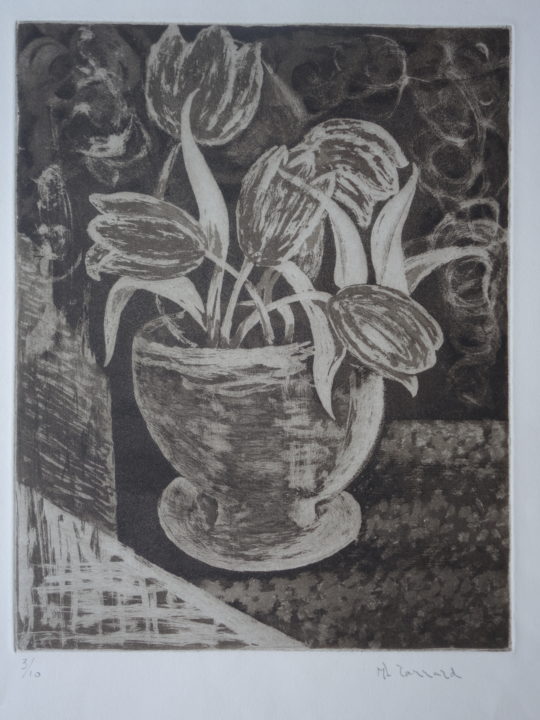 Tulipes Artiste CARRARD-KOHLER Marie-Louise Numéro d'inventaire FAA-CML-3393 Titre Tulipes Année 1969 Dimensions sur chassis 43.5x34 cm Technique / Support Aquatinte Catégories Nature morte Signature / Datation "ML Carrard" bd Remarques - 1 épreuve justifiée 3/10 - 2 épreuves ni signées ni justifiées - Titre et date manuscrits sur le journal d'emballage de la plaque, daté 1969 Agrandir l'image Découvrez l'artiste CARRARD-KOHLER Marie-Louise Châtelard Orbe (CH) 5 septembre 1901 / 1 décembre 1981 Fonds géré par la FAA Consulter sa fiche