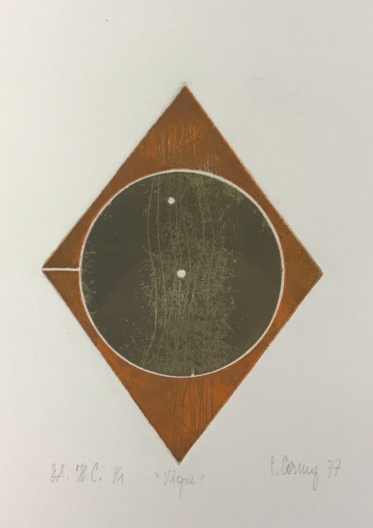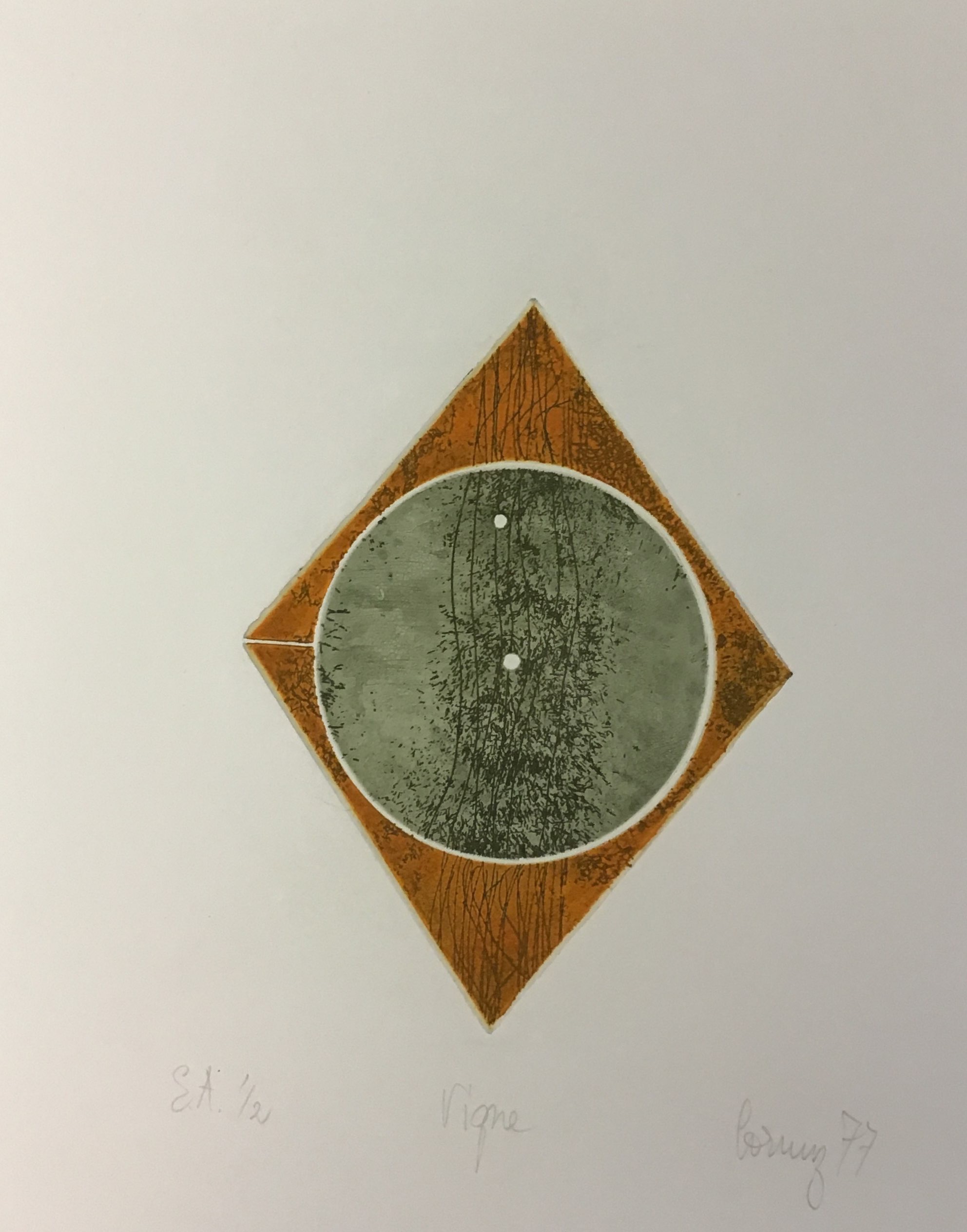 Vigne Artiste CORNUZ-MOLLES Christiane Numéro d'inventaire FAA-CC-3802 Titre Vigne Disponibilité Œuvre inaliénable Année 1977 Technique / Support Aquatinte, Eau forte, Papier Catégories Non figuratif Signature / Datation « Cornuz 77 » bd Remarques - 1 épreuve justifiée E.A. H.C. 1/1, titrée, signée et datée - 1 épreuve justifiée E.A., 1/2, titrée, signée et datée - 1 épreuve justifiée E.A., titrée et signée - 3 variantes couleur Agrandir l'image Découvrez l'artiste CORNUZ-MOLLES Christiane (CH) 19 janvier 1939 / 11 juillet 2005 Fonds géré par la FAA Consulter sa fiche Images complémentaires CORNUZ-MOLLES Christiane – Vigne 1977 – Aquatinte, Eau forte, Papier – Non figuratif CORNUZ-MOLLES Christiane – Vigne 1977 – Aquatinte, Eau forte, Papier – Non figuratif
